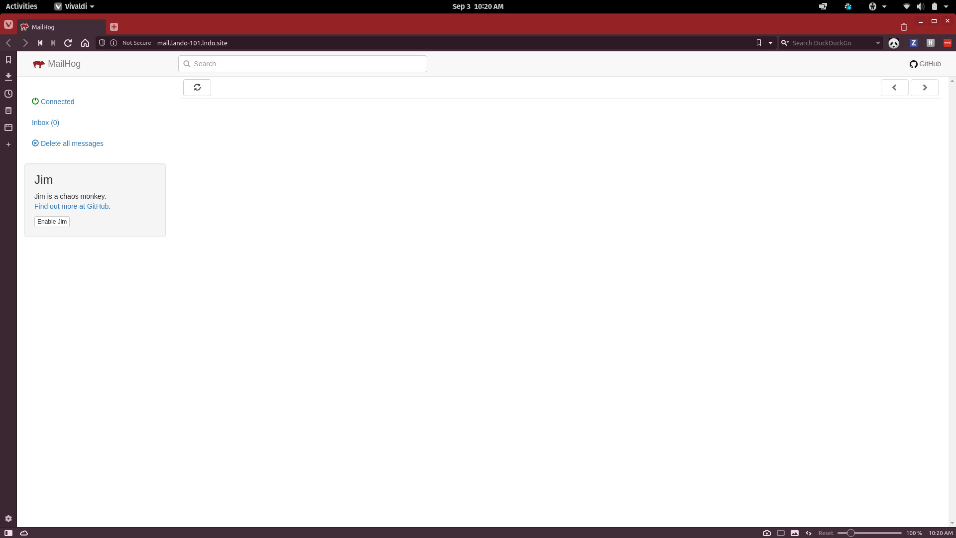 lando rebuild -yAfter rebuilding we can now access the new mail.lando-101.lndo.site URL to view the MailHog dashboard.